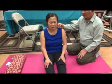 trị liệu ở phía sau, hai bàn tay ôm đầu nguời bệnh, đầu hai ngón tay cái cùng